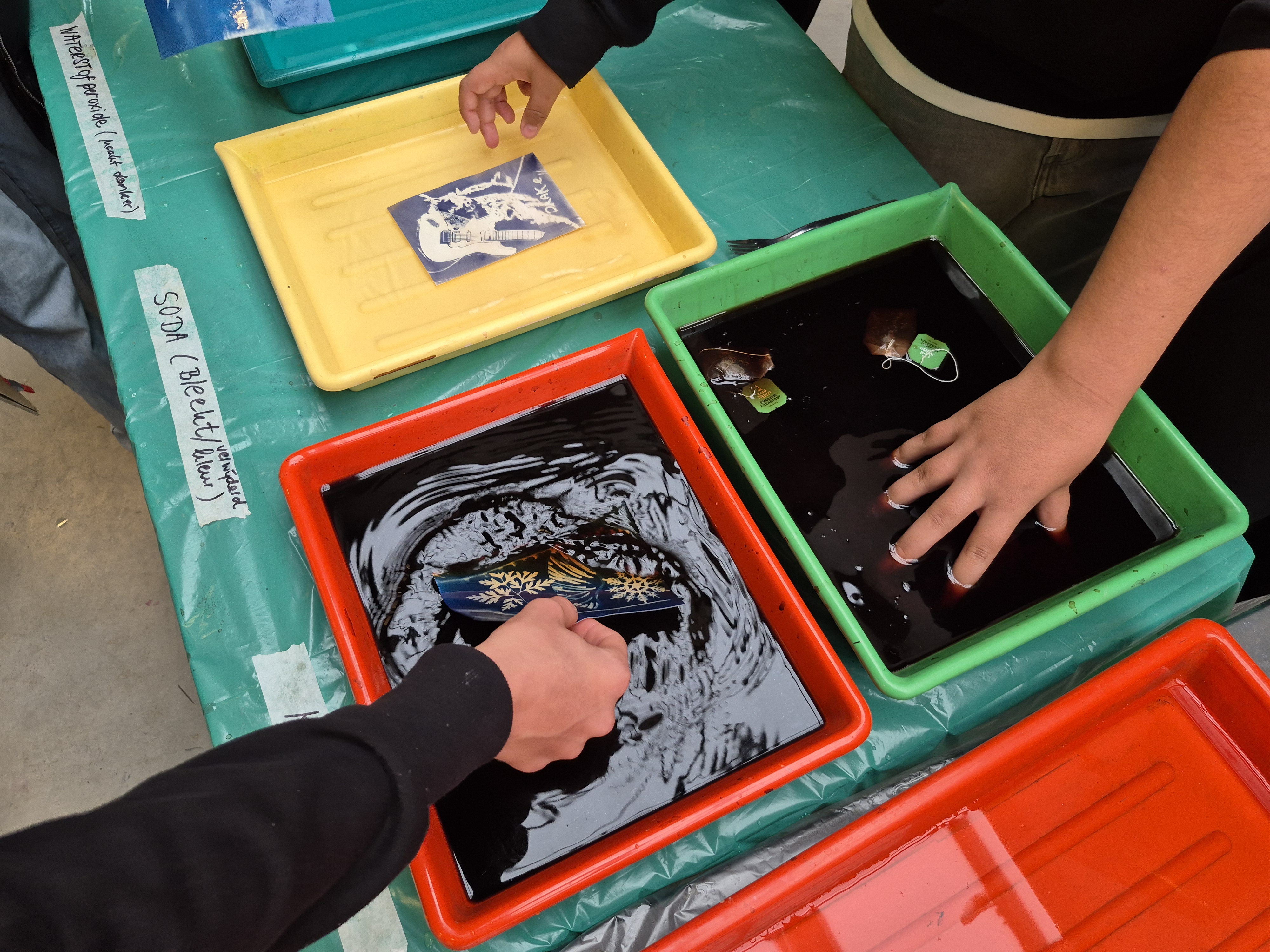 Begin oktober kregen de mavo 3-klassen van het ONC Parkdreef uitgebreid les in cyanotypie, onder leiding van Henri Blommers, filmmaker Eline Schellekens en Majke Lüthi. Na een levendige discussie over wat kunst nu eigenlijk is, mochten de leerlingen twee uur lang experimenteren met materialen als kurkuma, zout, pigment en azijn mét zonlicht en creatieve vrijheid. Zo ontdekten ze dat kunst veel meer kan zijn dan een olieverfschilderij in een museum. De vervolglessen worden verzorgd door de eigen docenten van ONC, en het project wordt afgesloten met een presentatie van hun werk in kunstcafé Kiki.