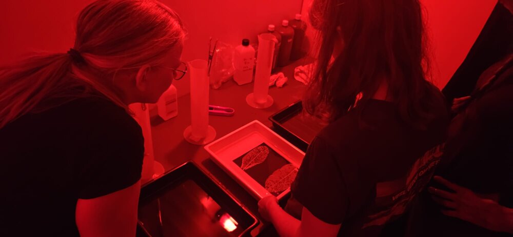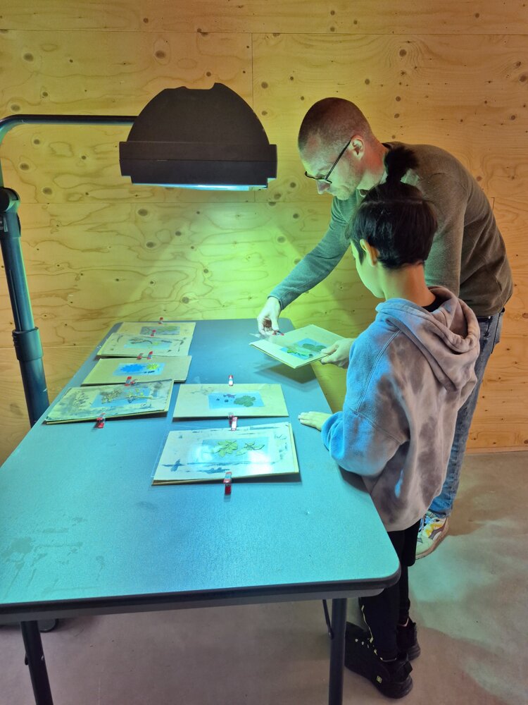Cyanotypie is een van de oudste fotografische technieken: met behulp van zonlicht en een lichtgevoelige emulsie ontstaan diepblauwe afdrukken, een magisch proces waarbij toeval en experiment de hoofdrol spelen. De leerlingen gingen enthousiast aan de slag, en velen lieten trots hun blauwdruk achter, zodat hun werk “in een echt museum hing.”